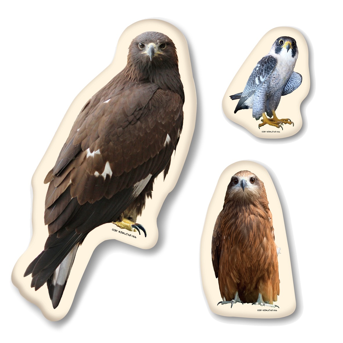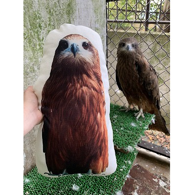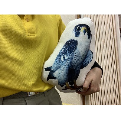 ニホンイヌワシの竜胆、トビの八兵衛(メス)、ハヤブサの善(オス)の3種類。鮮やかな昇華転写プリントと、インテリアとしても映えるテクスチャのある生地で作っています。あなたの部屋に猛禽類のいる生活を!