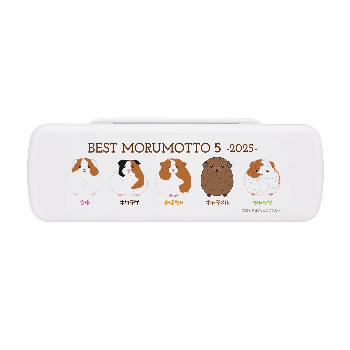 見事勝ち抜いた上位5頭のモルモットたちを飼育員がイラストに描き、ペンケースにしました。ペンケース以外にも小物の収納や、老眼鏡などの小さく薄いメガネのケースとしてもご利用いただけます。